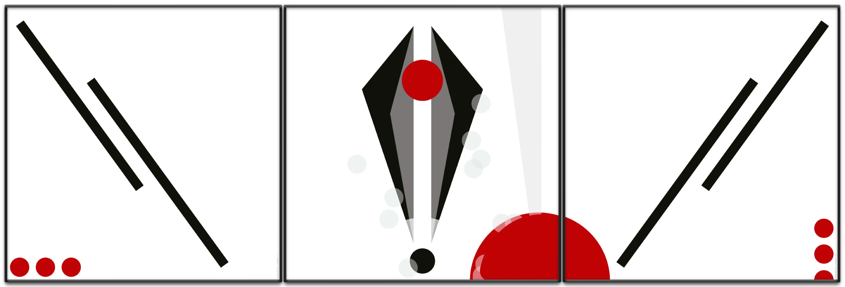 Im zentralen Panel ist die stilisierte Darstellung einer Vulva zu sehen, die durch schwarze dreieckige Formen und einen roten Punkt als Klitoris an der Spitze dargestellt wird. Der rote Punkt, der die Klitoris symbolisiert, stellt das Zentrum der weiblichen Lust dar und rückt die weibliche Sexualität und den Orgasmus in den Mittelpunkt des Werkes. Diese bewusste Fokussierung auf das weibliche Lustorgan hebt die Bedeutung der weiblichen Befriedigung im sexuellen Austausch hervor.